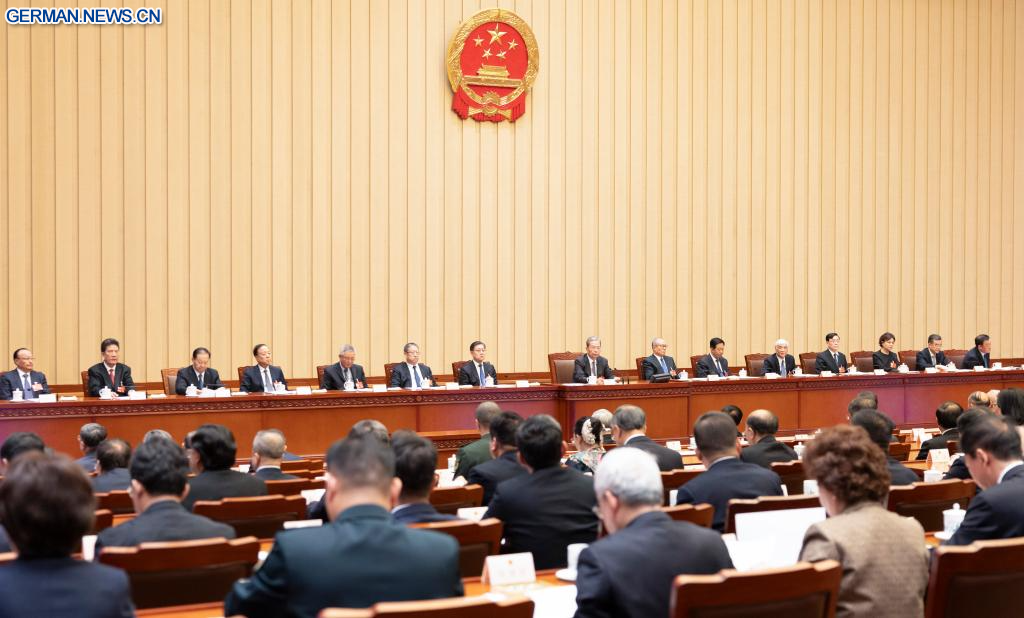 BEIJING, 4. März 2026 (Xinhuanet) -- Zhao Leji, Vorsitzender des Ständigen Ausschusses des Nationalen Volkskongresses (NVK), leitet die 64. Sitzung des Rates der Vorsitzenden des Ständigen Ausschusses des 14. NVK in der Großen Halle des Volkes in Chinas Hauptstadt Beijing, 4. März 2026. (Quelle: Xinhua/Rao Aimin)