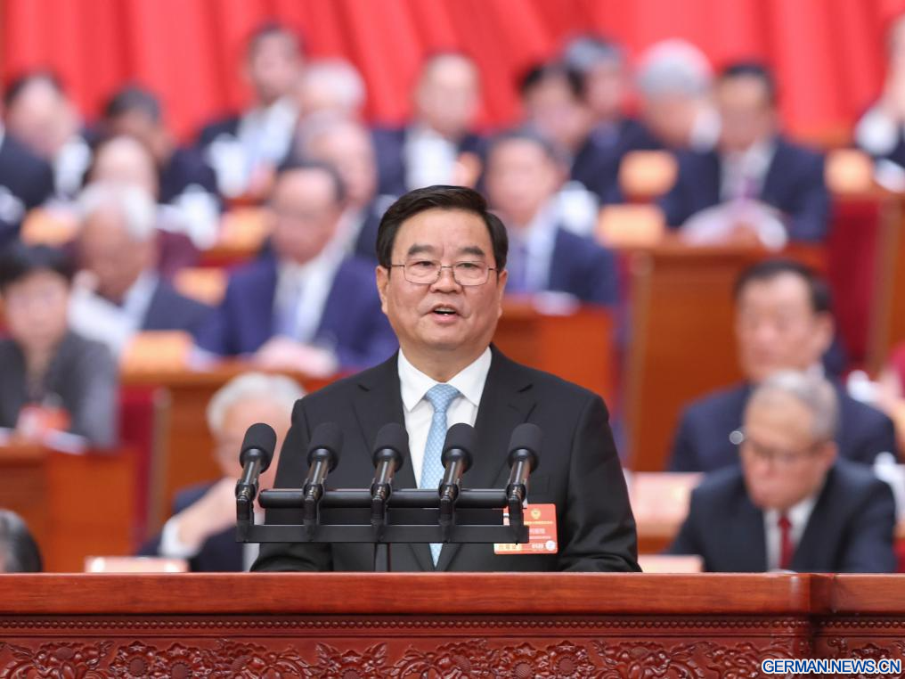 BEIJING, 4. März 2026 (Xinhuanet) -- He Baoxiang liefert einen Bericht darüber, wie die Vorschläge der politischen Berater seit der dritten Tagung des 14. Landeskomitees der Politischen Konsultativkonferenz des chinesischen Volkes (PKKCV) behandelt wurden, im Namen des Ständigen Ausschusses des Landeskomitees der PKKCV auf der Eröffnungssitzung der vierten Tagung des 14. Landeskomitees der PKKCV in der Großen Halle des Volkes in Chinas Hauptstadt Beijing, 4. März 2026. (Quelle: Xinhua/Liu Weibing)