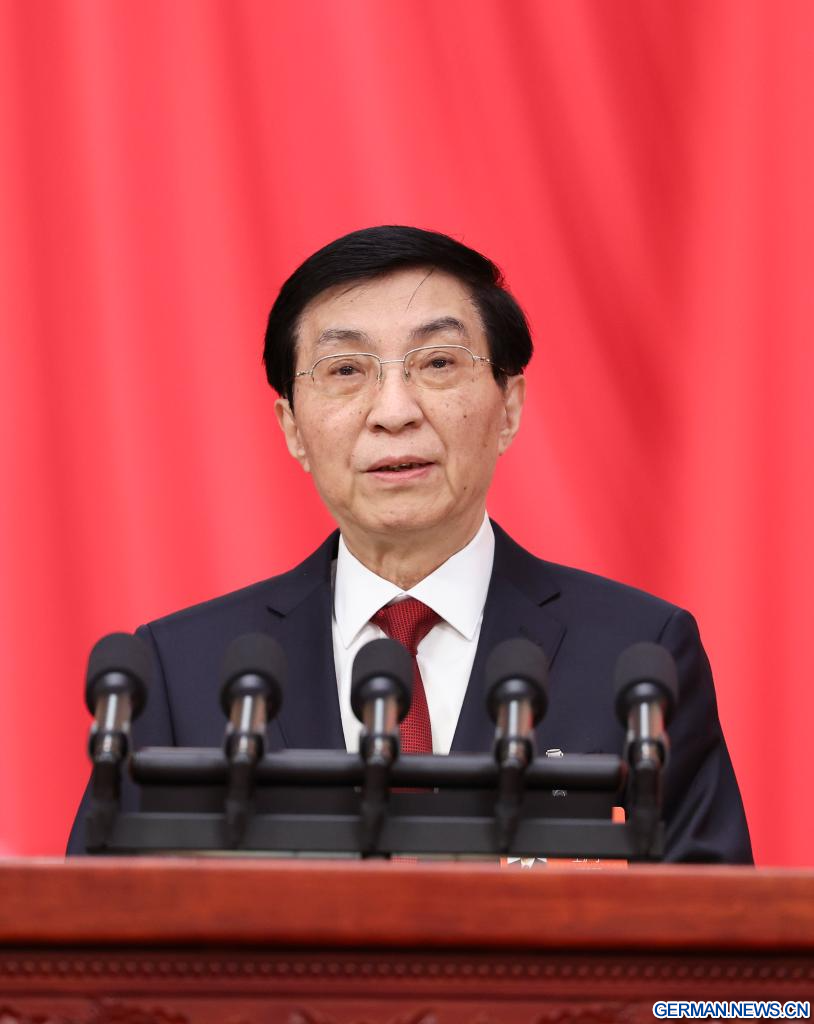 BEIJING, 4. März 2026 (Xinhuanet) -- Wang Huning, Vorsitzender des Landeskomitees der Politischen Konsultativkonferenz des Chinesischen Volkes (PKKCV), liefert im Namen des Ständigen Ausschusses des Landeskomitees der PKKCV einen Tätigkeitsbericht auf der Eröffnungssitzung der vierten Tagung des 14. Landeskomitees der PKKCV in der Großen Halle des Volkes in Chinas Hauptstadt Beijing, 4. März 2026. (Quelle: Xinhua/Yao Dawei)