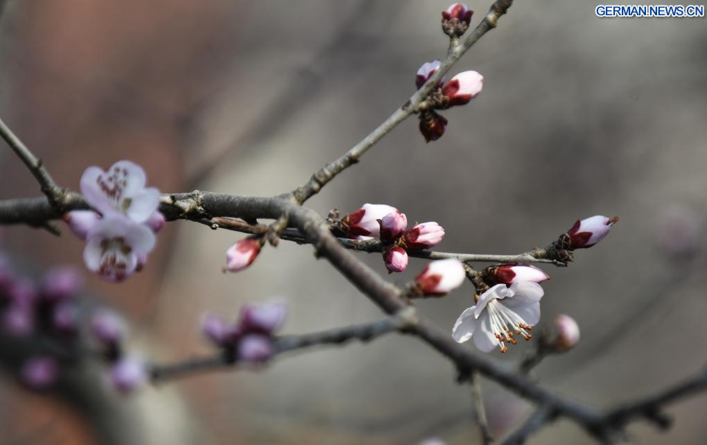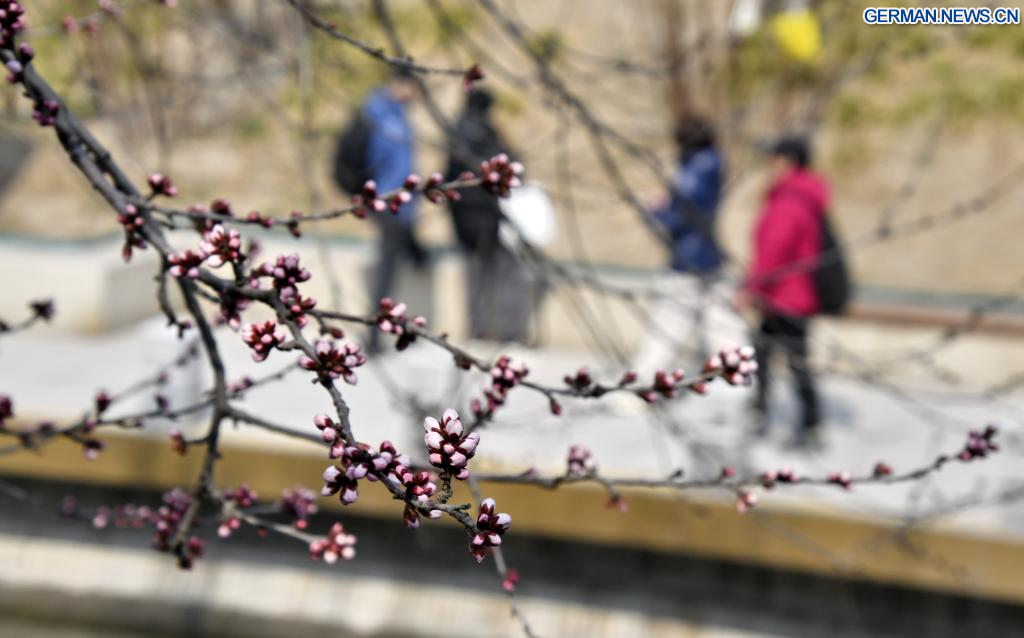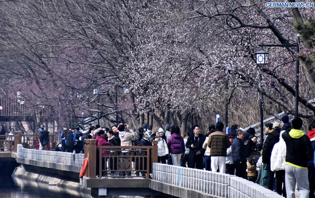BEIJING, 8. März 2026 (Xinhuanet) -- Menschen bewundern die Pfirsichblüten im Bezirk Chaoyang in der chinesischen Hauptstadt Beijing, 8. März 2026. (Quelle: Xinhua/Li Xin)