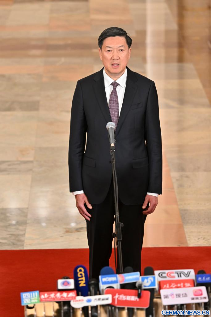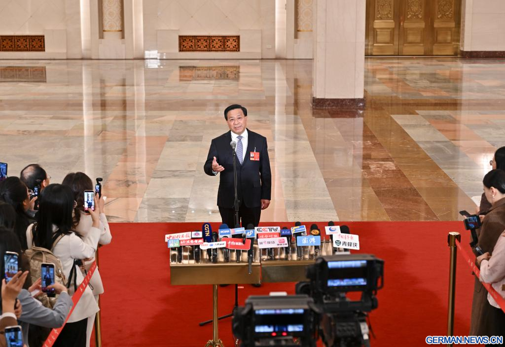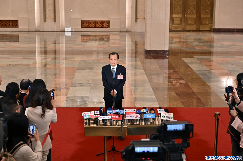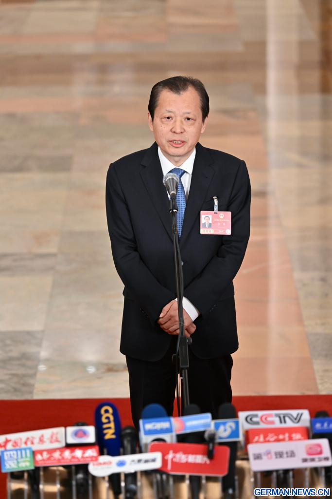 BEIJING, 9. März 2026 (Xinhuanet) -- Der chinesische Verkehrsminister Liu Wei gibt nach der zweiten Plenarsitzung der vierten Tagung des 14. Nationalen Volkskongresses (NVK) in der Großen Halle des Volkes in der chinesischen Hauptstadt Beijing ein Interview, 9. März 2026. (Quelle: Xinhua/Li Xin)