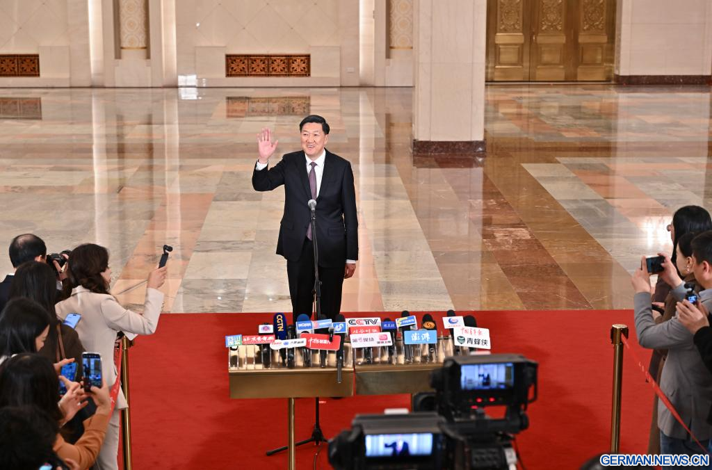 BEIJING, 9. März 2026 (Xinhuanet) -- Der chinesische Minister für Landwirtschaft und ländliche Angelegenheiten Han Jun gibt nach der zweiten Plenarsitzung der vierten Tagung des 14. Nationalen Volkskongresses (NVK) in der Großen Halle des Volkes in der chinesischen Hauptstadt Beijing ein Interview, 9. März 2026. (Quelle: Xinhua/Li Xin)