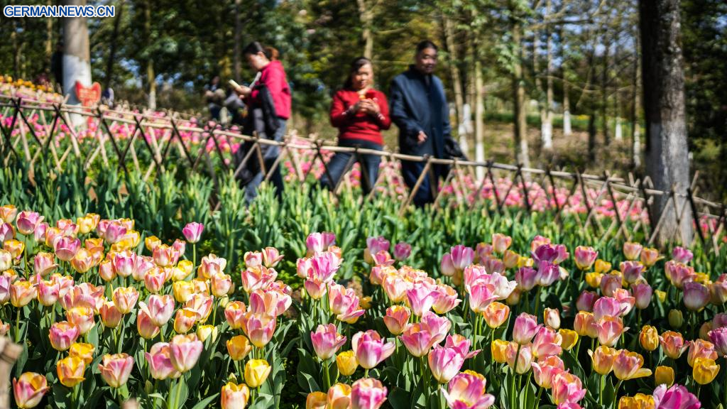 LONGLI, 12. März 2026 (Xinhuanet) -- Eine Touristin bewundert Tulpen im Longjiashan-Nationalwaldpark im Kreis Longli in der südwestchinesischen Provinz Guizhou, 12. März 2026. (Quelle: Xinhua/Tao Liang)