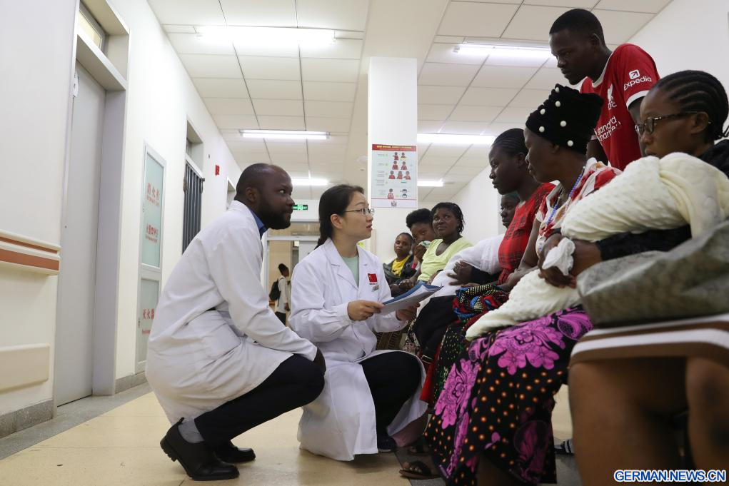 LUSAKA, 18. März 2026 (Xinhuanet) -- Eine chinesische Ärztin und ein lokaler medizinischer Mitarbeiter unterhalten sich mit Patienten, die auf Untersuchung warten, im Levy Mwanawasa University Teaching Hospital in Lusaka, Sambia, 17. März 2026. Das 26. chinesische Ärzteteam in Sambia traf im Juni 2025 in diesem afrikanischen Land ein. Das Team wurde in vier Gruppen aufgeteilt, die jeweils im University Teaching Hospital, im Levy Mwanawasa University Teaching Hospital, im Ndola Teaching Hospital und im Livingston Central Hospital tätig sind. (Quelle: Xinhua/Chen Wei)