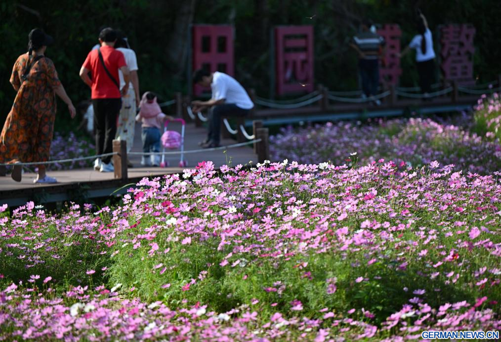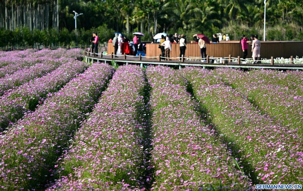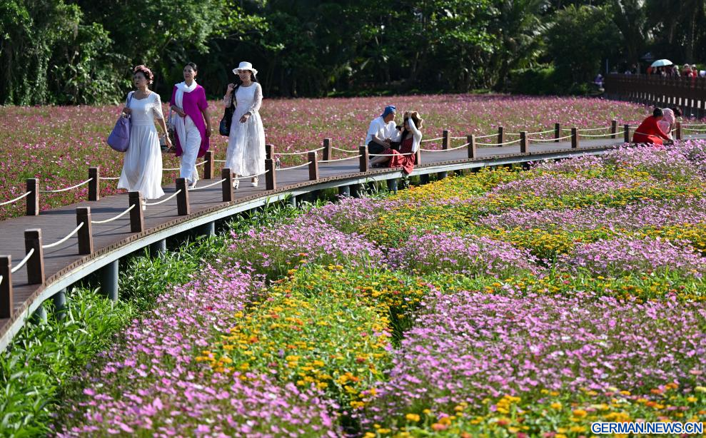 BOAO, 18. März 2026 (Xinhuanet) -- Touristen erfreuen sich an den Blumen im Dorf Nanqiang in der Gemeinde Boao in Qionghai in der südchinesischen Provinz Hainan, 17. März 2026. Die Blumen im Dorf Nanqiang stehen in voller Blüte und locken Touristen zu Besichtigungen an.