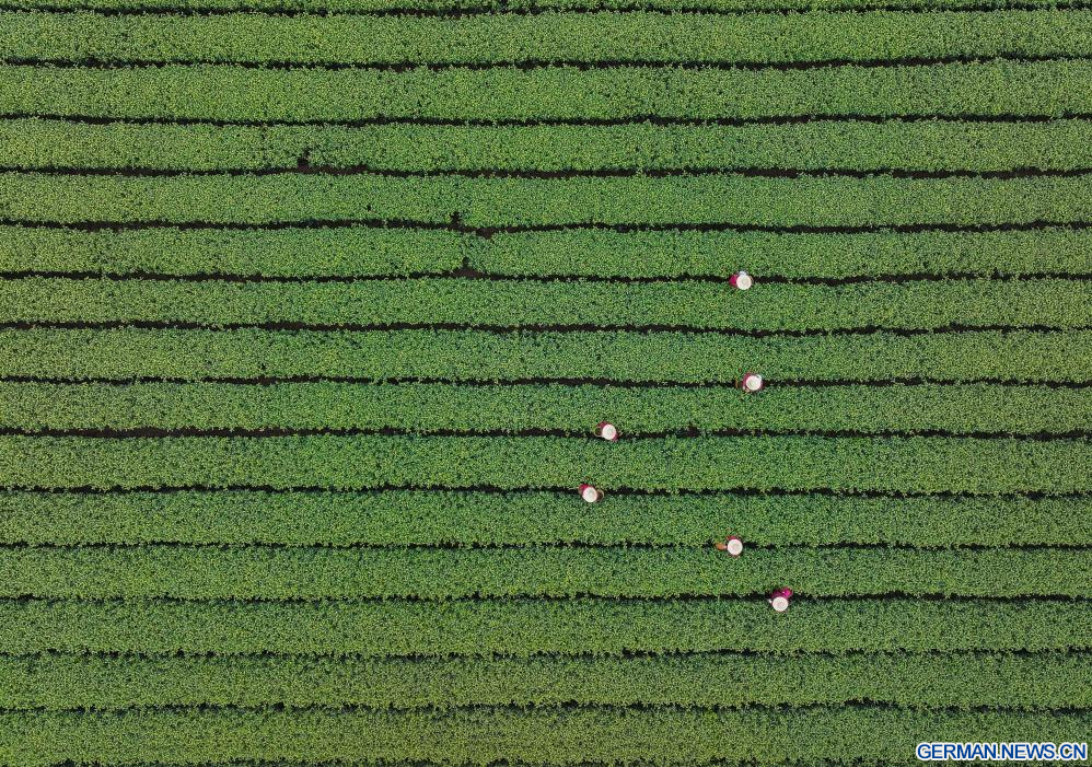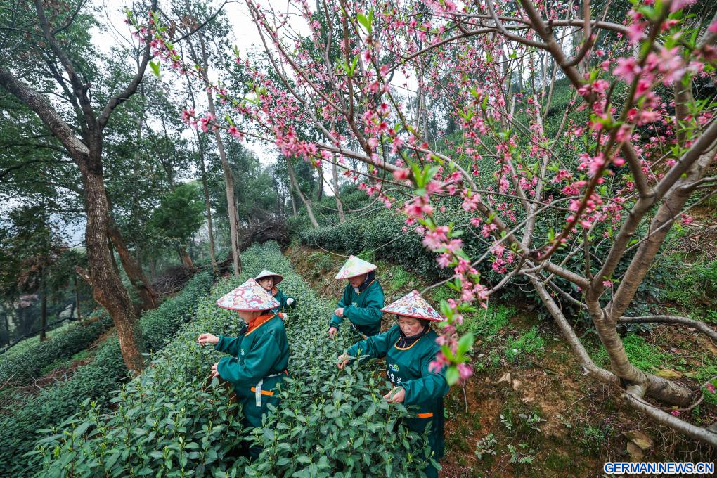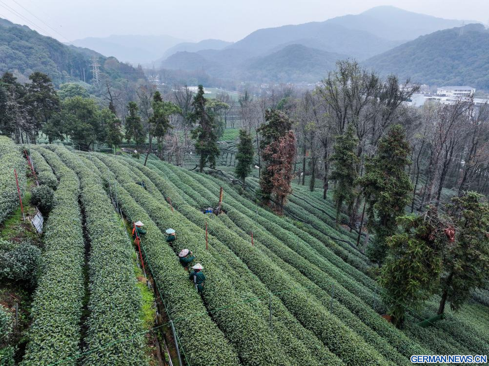 HANGZHOU, 19. März 2026 (Xinhuanet) -- Teebauern pflücken Teeblätter im Dorf Meijiawu in Hangzhou in der ostchinesischen Provinz Zhejiang, 19. März 2026. Teebauern in Hangzhou in der ostchinesischen Provinz Zhejiang begannen mit der Ernte des Westsee-Longjing-Tees, einer der beliebtesten Teesorten in China.