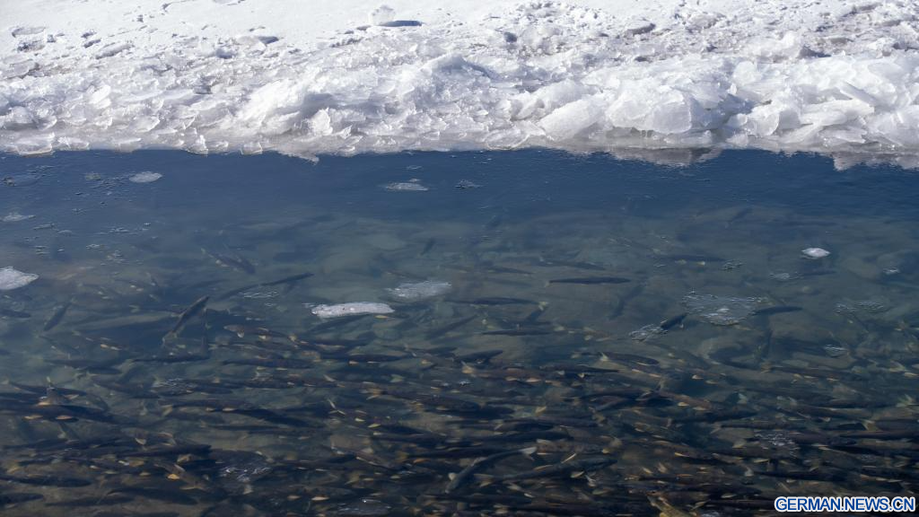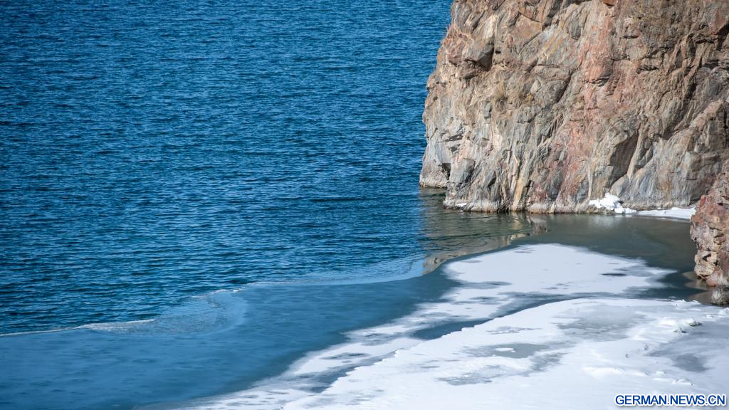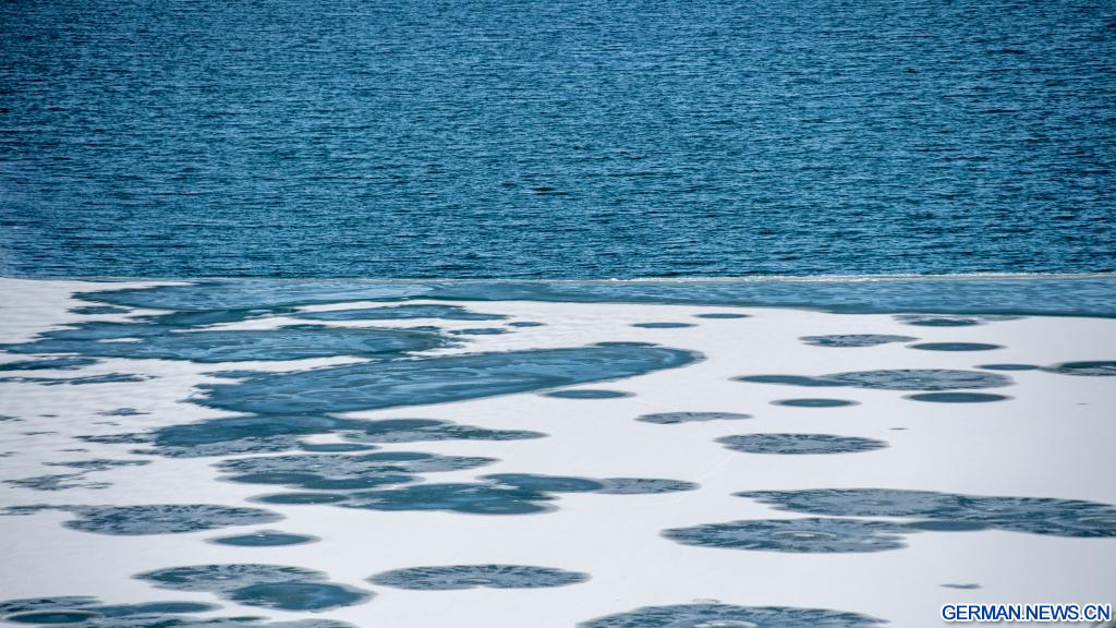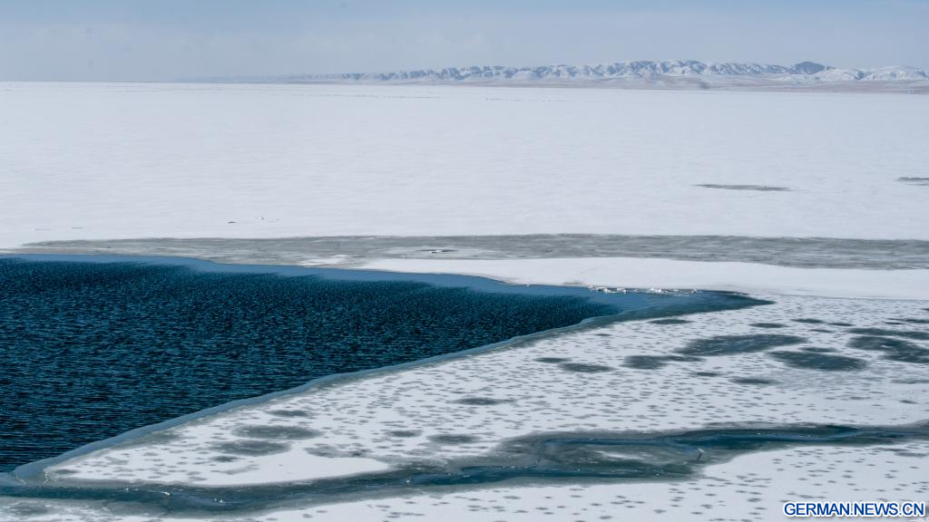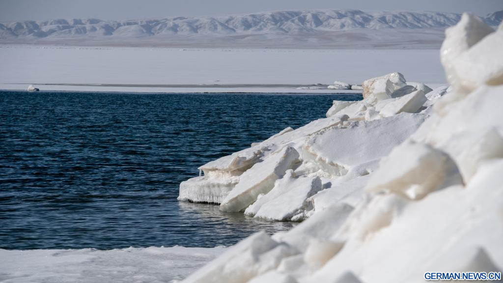 GANGCHA, 19. März 2026 (Xinhuanet) -- Das am 19. März 2026 aufgenommene Foto zeigt einen Blick auf den Qinghai-See, Chinas größten Binnen-Salzwassersee, in der nordwestchinesischen Provinz Qinghai. Mit dem Schmelzen des Eises auf der Seeoberfläche beginnt für den Qinghai-See die Frühlingszeit. (Quelle: Xinhua/Li Linhai)