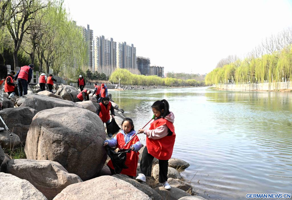 BEIJING, 22. März 2026 (Xinhuanet) -- Junge Freiwillige sammeln an einem Flussufer in Shijiazhuang in der nordchinesischen Provinz Hebei Müll ein, 22. März 2026. Der Wassertag fällt auf den 22. März. (Foto von Chen Qibao/Xinhua)
