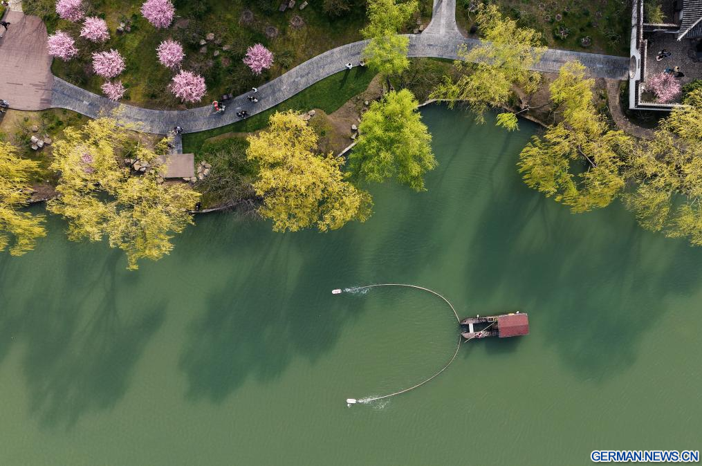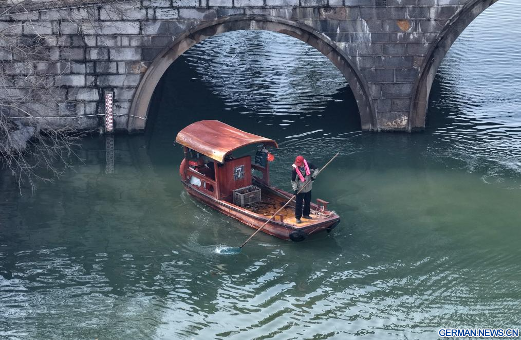 BEIJING, 22. März 2026 (Xinhuanet) -- Die Luftaufnahme einer Drohne zeigt die Arbeiter, die am Schlanken Westsee in Yangzhou in der ostchinesischen Provinz Jiangsu Schwimmkörper von der Wasseroberfläche einsammeln, 22. März 2026. Der Weltwassertag fällt auf den 22. März. (Foto von Meng Delong/Xinhua)
