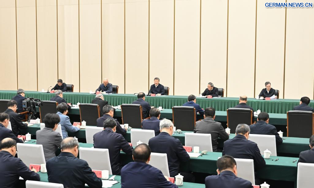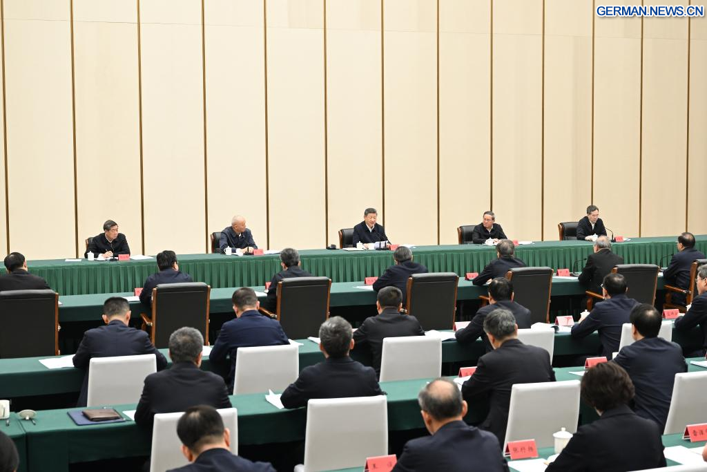 XIONG'AN, 23. März 2026 (Xinhuanet) -- Der chinesische Staatspräsident Xi Jinping, ebenfalls Generalsekretär des Zentralkomitees der Kommunistischen Partei Chinas und Vorsitzender der Zentralen Militärkommission, leitet in der Xiong'an New Area in der nordchinesischen Provinz Hebei ein Symposium zur weiteren Förderung des qualitativ hochwertigen Aufbaus und der Entwicklung der Xiong'an New Area, 23. März 2026. Xi inspizierte am Montag die Xiong'an New Area und übernahm zugleich den Vorsitz des Symposiums. (Quelle: Xinhua/Xie Huanchi)
