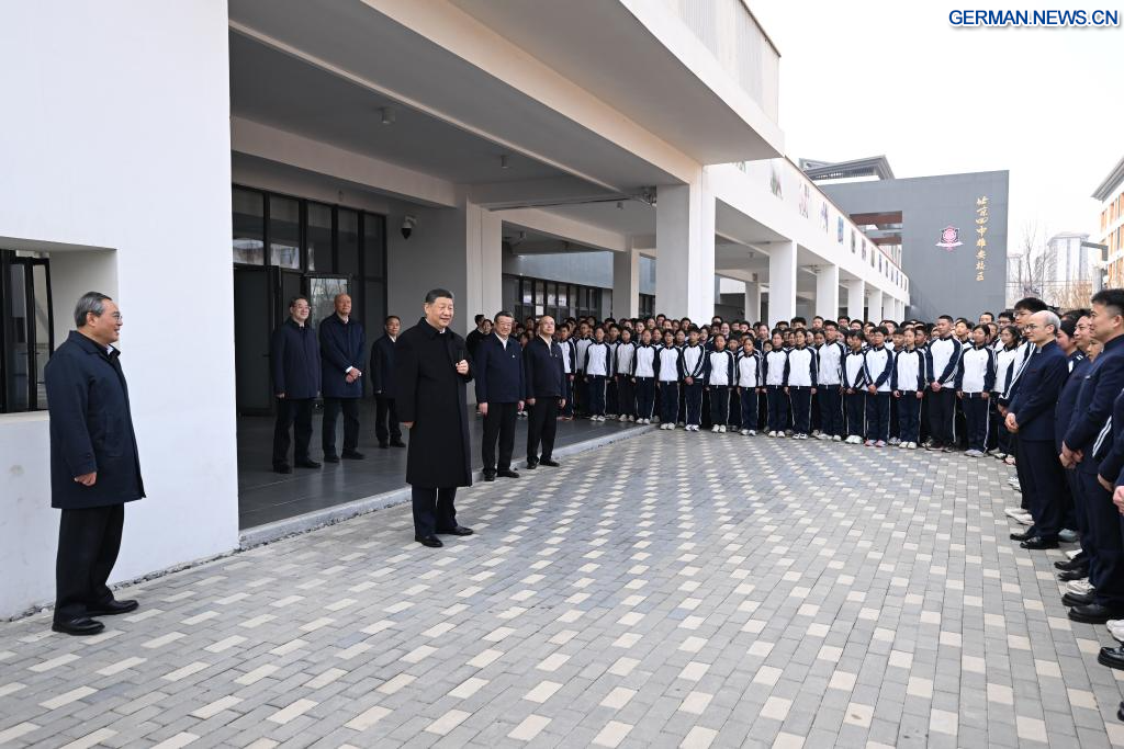 XIONG'AN, 23. März 2026 (Xinhuanet) -- Der chinesische Staatspräsident Xi Jinping, ebenfalls Generalsekretär des Zentralkomitees der Kommunistischen Partei Chinas und Vorsitzender der Zentralen Militärkommission, besucht den Xiong'an-Campus der Beijing No. 4 High School in der Xiong'an New Area in der nordchinesischen Provinz Hebei, 23. März 2026. Xi inspizierte am Montag die Xiong'an New Area und übernahm zugleich den Vorsitz eines Symposiums zur weiteren Förderung des qualitativ hochwertigen Aufbaus und der Entwicklung der Xiong'an New Area. (Quelle: Xinhua/Xie Huanchi)