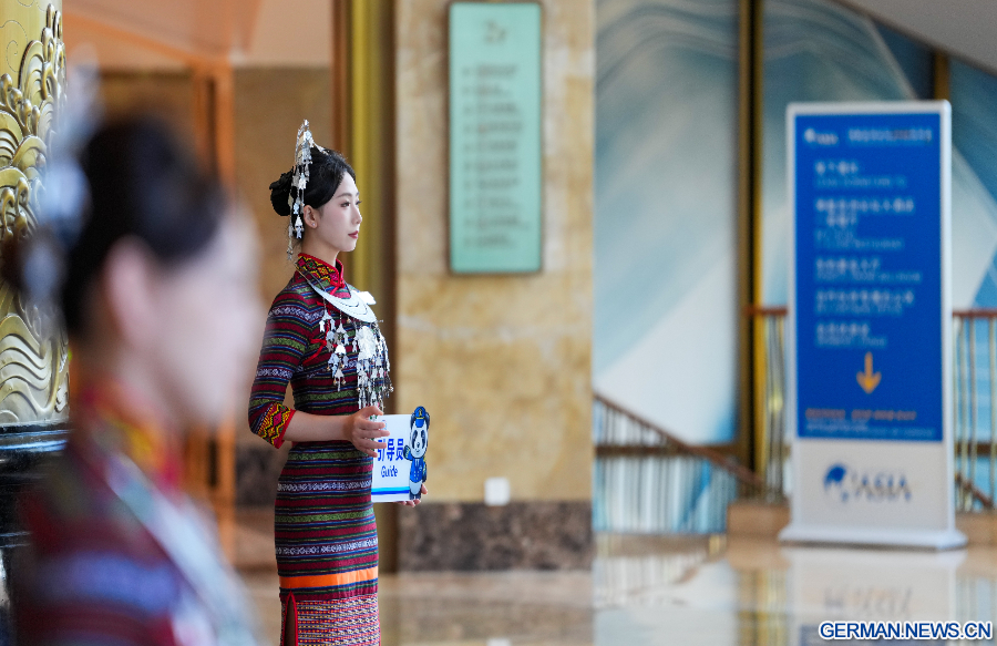 BOAO, 23. März 2026 (Xinhua) -- Das Foto zeigt Guides in Trachten der ethnischen Gruppe der Li im Hotel des Boao-Forums für Asien (BFA) in der Gemeinde Boao der Stadt Qionghai in der Provinz Hainan in Südchina, 23. März 2026. Die Jahreskonferenz 2026 des Boao-Forums für Asien findet vom 24. bis 27. März in Boao statt. (Xinhua/Yang Guanyu)