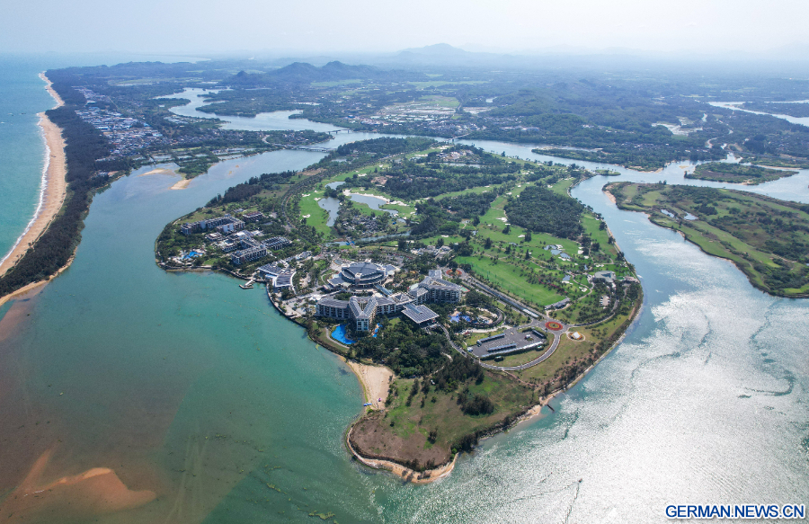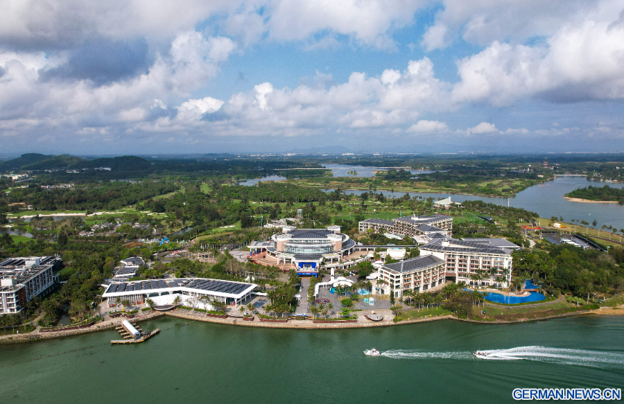 BOAO, 23. März 2026 (Xinhua) -- Die Luftaufnahme einer Drohne zeigt das Internationale Konferenzzentrum des Boao-Forums für Asien (BFA) auf der Insel Dongyu in der Gemeinde Boao der Stadt Qionghai in der Provinz Hainan in Südchina, 19. März 2026. Die Jahreskonferenz 2026 des Boao-Forums für Asien findet vom 24. bis 27. März in Boao statt. (Xinhua/Yang Guanyu)