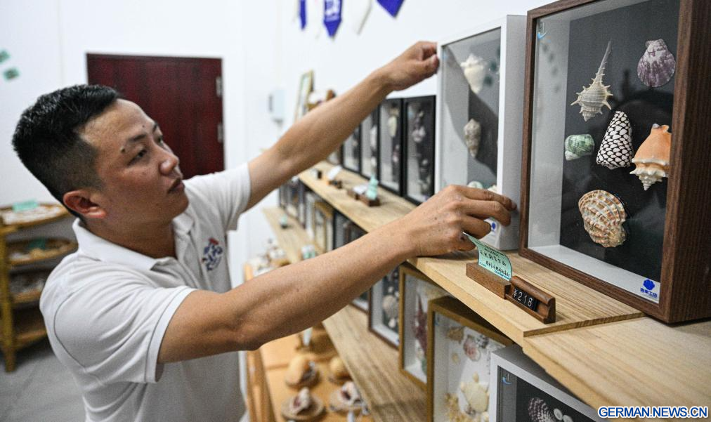 SANSHA, 23. März 2026 (Xinhuanet) -- Ein Mitarbeiter platziert Kunstwerke aus Muschelpräparaten in einem Geschäft auf der Insel Zhaoshu in Sansha in der südchinesischen Provinz Hainan, 19. März 2026.
