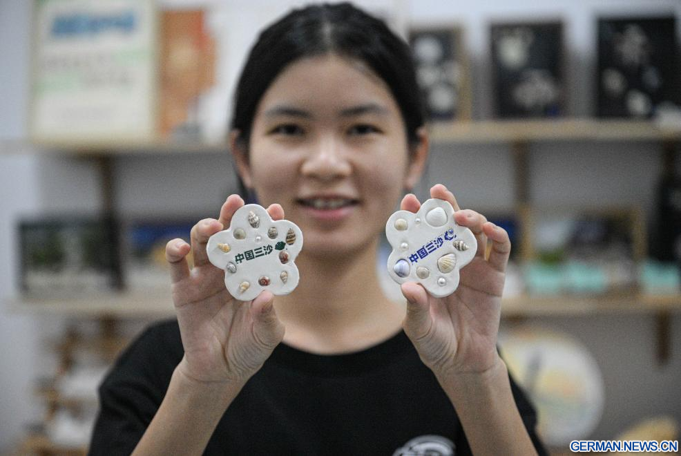 SANSHA, 23. März 2026 (Xinhuanet) -- Eine Stadtbewohnerin zeigt selbstgemachte Kühlschrankmagnete in einem Geschäft auf der Insel Zhaoshu in Sansha in der südchinesischen Provinz Hainan, 19. März 2026.