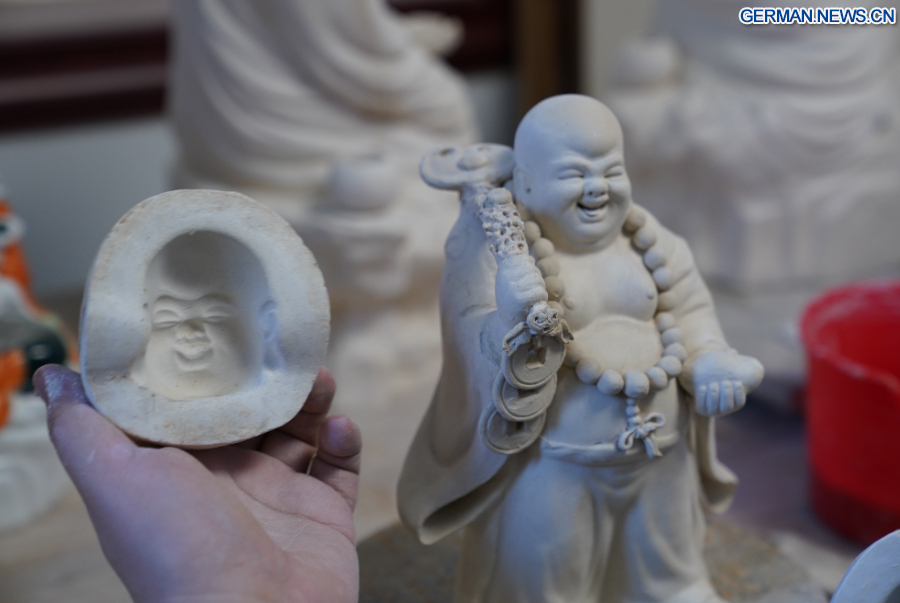 Der 36-jährige Zeng Rui ist der Erbe der Familientradition in vierter Generation. Im Jahr 2011 kehrte er in seine Heimat zurück, um bei seinem Vater die Porzellankunst zu erlernen, und eignete sich verschiedene Techniken der Herstellung von Skulpturen an. Nachdem der „sprachlose Buddha“ im Jahr 2023 viral gegangen war, gründete Zeng ein Atelier, um das Originalwerk nachzubilden und davon inspirierte Kultur- und Kreativprodukte zu entwickeln. Für Zeng Rui ist Tradition die Grundlage. Indem klassische Themen und Techniken bewahrt und gleichzeitig für ein zeitgenössisches Publikum neu interpretiert werden, kann altehrwürdige Kunst wiederbelebt werden. (Xinhua/Zhou Mi)