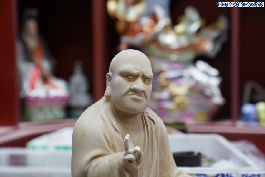 NANCHANG, 24. März 2026 (Xinhua) -- Das Foto zeigt eine Porzellanskulptur aus dem Atelier von Zeng Rui in Jingdezhen in der Provinz Jiangxi in Ostchina, 12. März 2026. Eine Porzellanskulptur eines Arhats, die im Jingdezhen China Ceramics Museum ausgestellt ist, erlangte im Internet Berühmtheit, nachdem Internetnutzer ihr wegen ihres liebenswert charmanten Gesichtsausdrucks den Spitznamen „sprachloser Buddha“ gegeben hatten. Das Kunstwerk wurde vor mehr als 80 Jahren von Zeng Longsheng geschaffen, einem Meister der chinesischen Porzellankunst, der eine lange Familientradition im Bereich der Porzellanskulpturen begründete.
