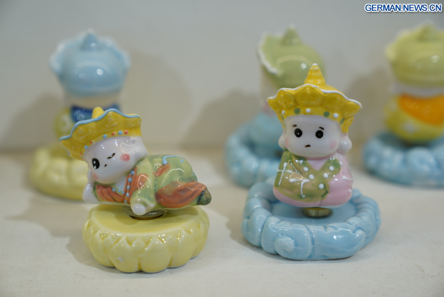 NANCHANG, 24. März 2026 (Xinhua) -- Das Foto zeigt vom „sprachlosen Buddha“ inspirierte Kultur- und Kreativprodukte im Atelier von Zeng Rui in Jingdezhen in der Provinz Jiangxi in Ostchina, 12. März 2026. Eine Porzellanskulptur eines Arhats, die im Jingdezhen China Ceramics Museum ausgestellt ist, erlangte im Internet Berühmtheit, nachdem Internetnutzer ihr wegen ihres liebenswert charmanten Gesichtsausdrucks den Spitznamen „sprachloser Buddha“ gegeben hatten. Das Kunstwerk wurde vor mehr als 80 Jahren von Zeng Longsheng geschaffen, einem Meister der chinesischen Porzellankunst, der eine lange Familientradition im Bereich der Porzellanskulpturen begründete.