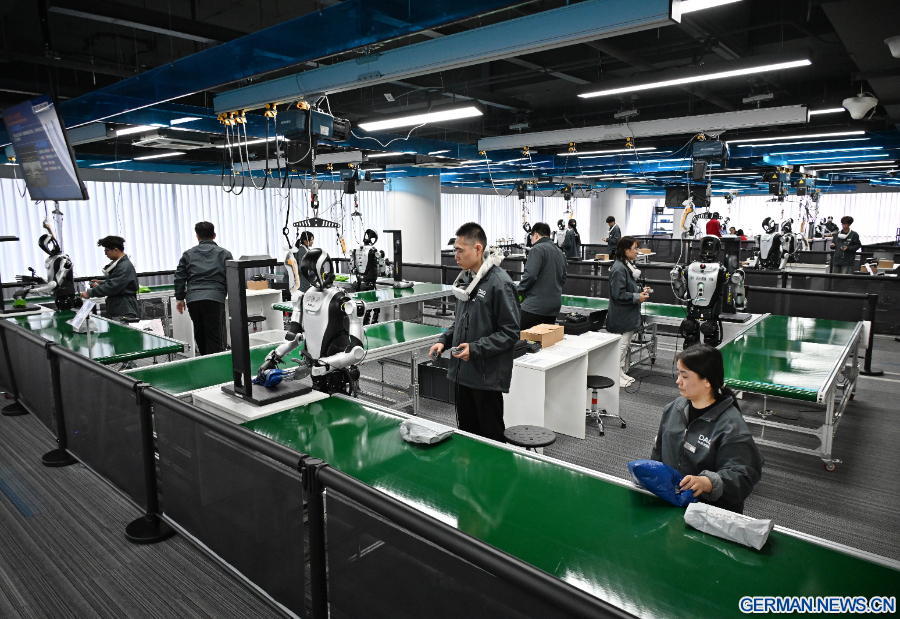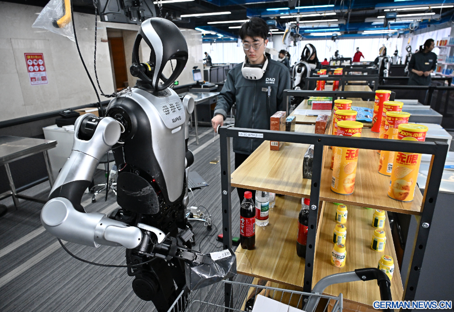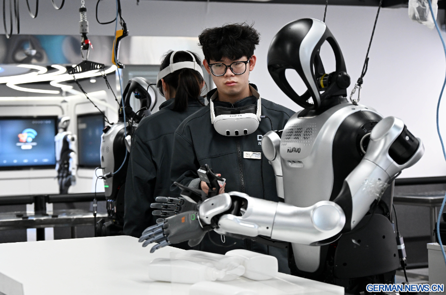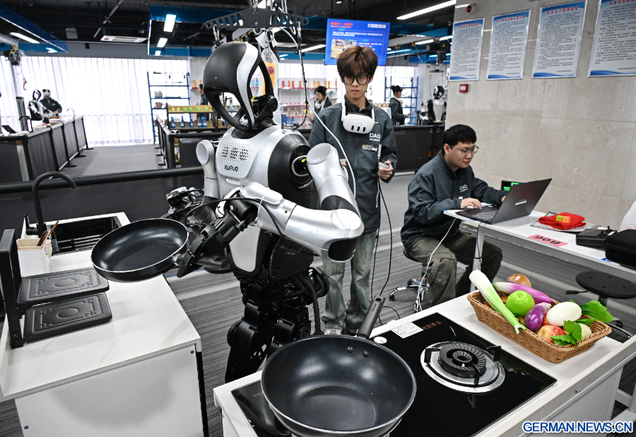 Datenerfasser steuern hier Roboter bei bestimmten Aufgaben wie Logistiksortierung, Nachfüllen im Supermarkt, Küchenarbeiten und die Montage von Bauteilen. Durch Tausende von Wiederholungen und Versuchen werden riesige Mengen an Bewegungsdaten generiert, die den Robotern ein smarteres „intelligentes Gehirn“ verleihen und dazu beitragen, dass humanoide Roboter in alle Lebensbereiche Einzug halten, um Tausende von Haushalten zu unterstützen. (Xinhua/Li Ziheng)