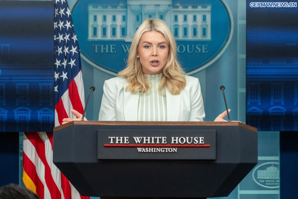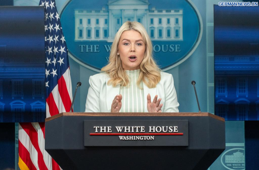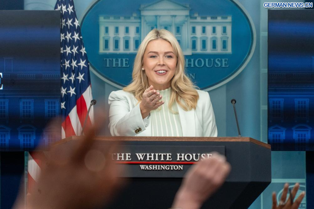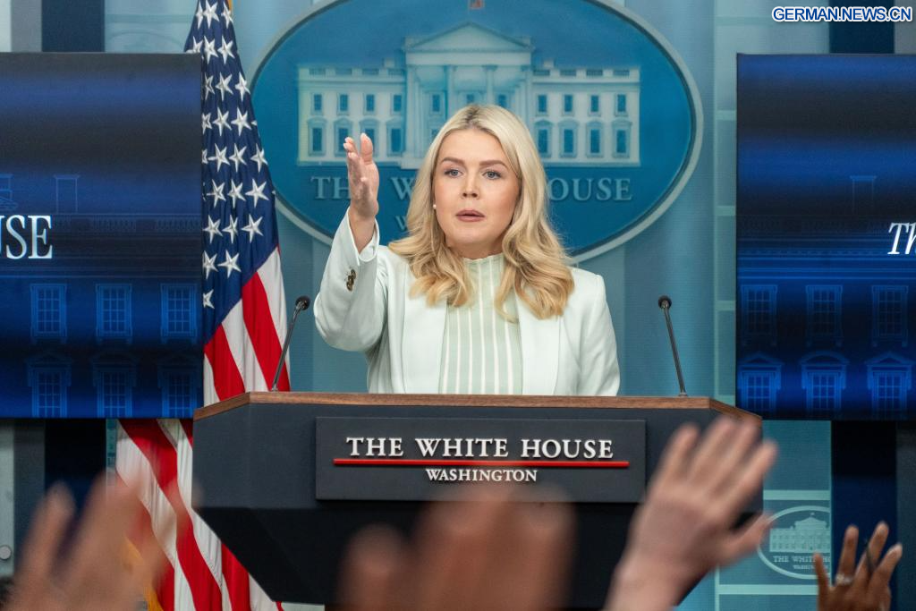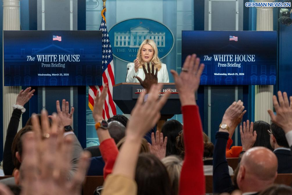 WASHINGTON, 25. März 2026 (Xinhuanet) -- Die Pressesprecherin des Weißen Hauses, Karoline Leavitt, spricht auf einer Pressekonferenz im Weißen Haus in Washington, D.C., den Vereinigten Staaten, 25. März 2026. US-Präsident Donald Trump werde „die Hölle entfesseln“, falls der Iran sich weigert, im Hinblick auf den andauernden US-israelischen Krieg gegen den Iran eine Vereinbarung zu treffen, sagte Karoline Leavitt am Mittwoch. (Foto von Li Yuanqing/Xinhuanet)