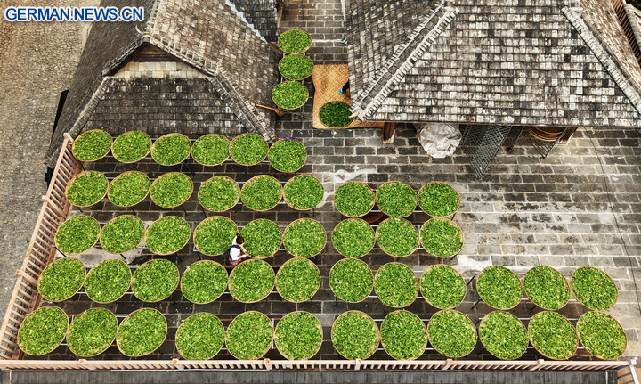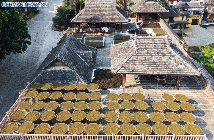PU'ER, 27. März 2026 (Xinhua) -- Die Luftaufnahme einer Drohne zeigt die Trocknung von Teeblättern im Dorf Jingmai im Kreis Lancang in der Stadt Pu'er in der Provinz Yunnan im Südwesten Chinas, 26. März 2026.