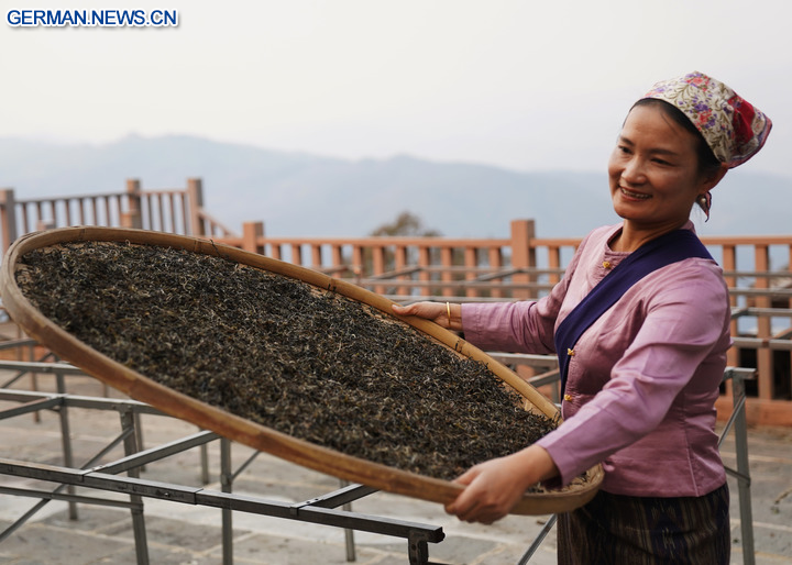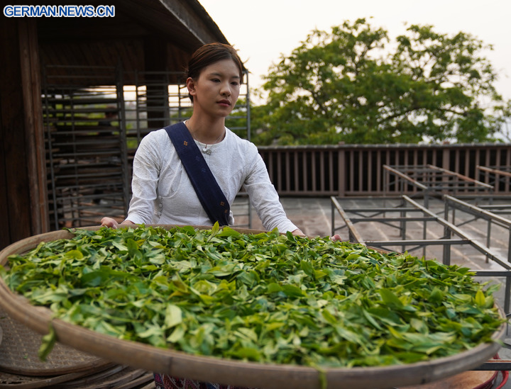 PU'ER, 27. März 2026 (Xinhua) -- Das Foto zeigt eine Landwirtin beim Auslegen von Teeblättern zur Trocknung im Dorf Jingmai im Kreis Lancang in der Stadt Pu'er in der Provinz Yunnan im Südwesten Chinas, 26. März 2026.