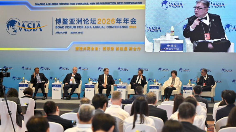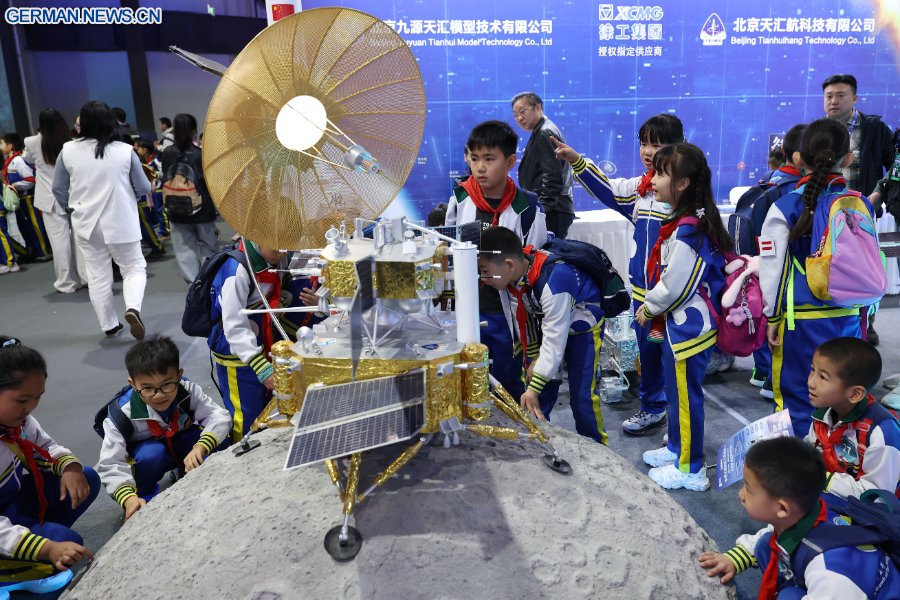 BEIJING, 28. März 2026 (Xinhua) -- Schüler betrachten ein Exponat auf der International Sci-Fi and Future Tech Expo Beijing 2026 in der chinesischen Hauptstadt Beijing, 27. März 2026. (Xinhua/Zhang Chenlin)