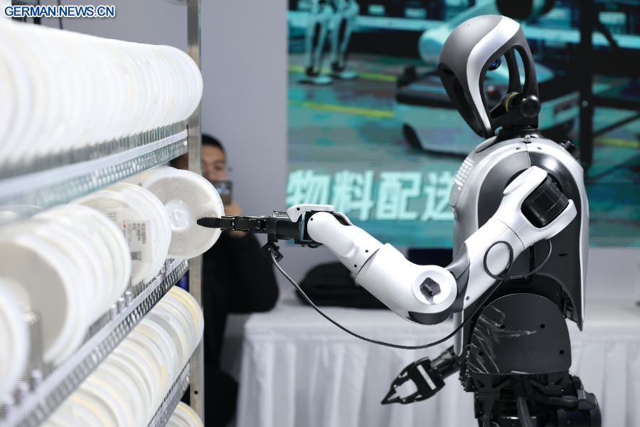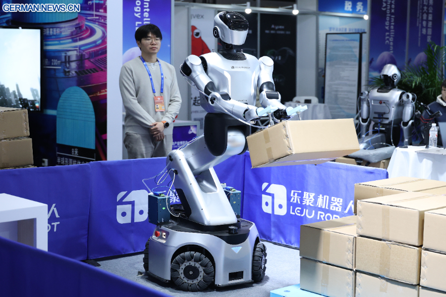 BEIJING, 28. März 2026 (Xinhua) -- Ein Roboter bewegt einen Karton auf der International Sci-Fi and Future Tech Expo Beijing 2026 in der chinesischen Hauptstadt Beijing, 27. März 2026. (Xinhua/Zhang Chenlin)