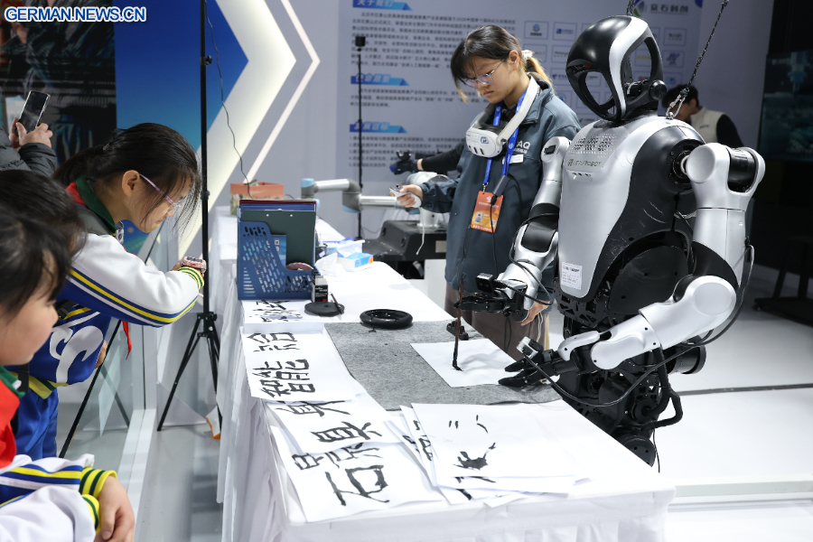 BEIJING, 28. März 2026 (Xinhua) -- Ein Roboter fertigt eine Kalligrafie auf der International Sci-Fi and Future Tech Expo Beijing 2026 in der chinesischen Hauptstadt Beijing an, 27. März 2026. (Xinhua/Zhang Chenlin)
