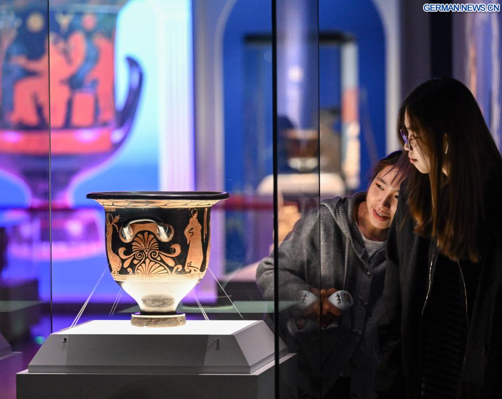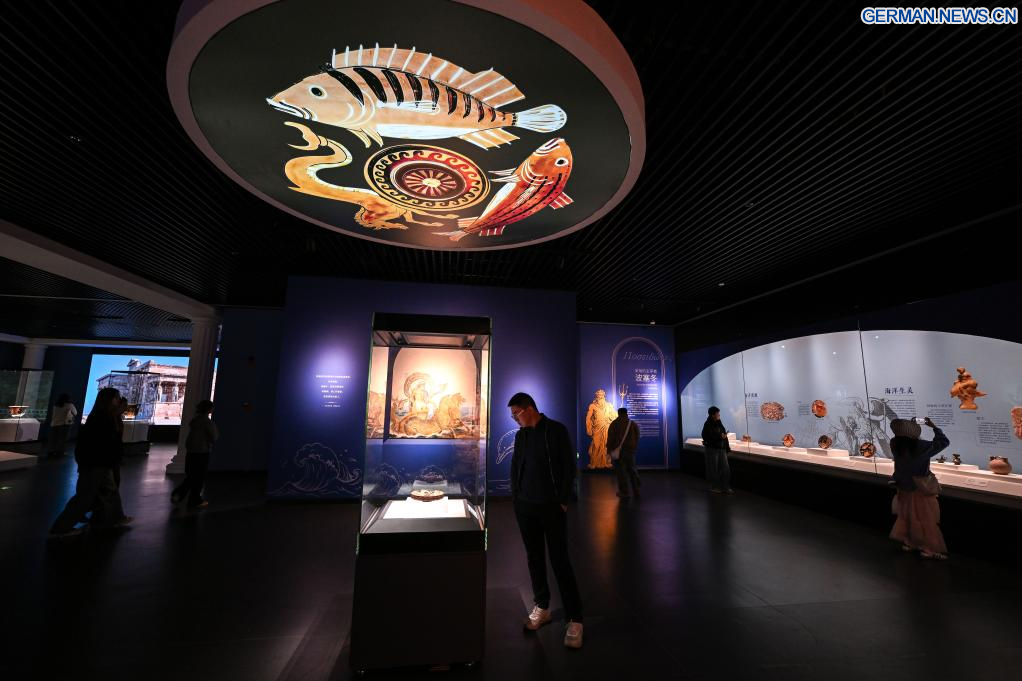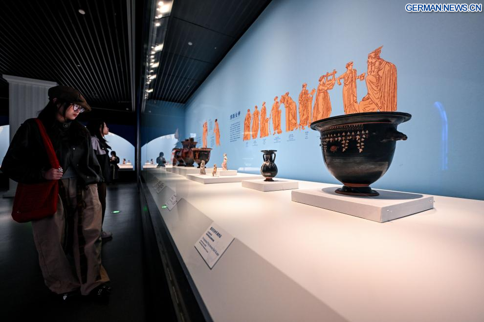 YINCHUAN, 31. März 2026 (Xinhuanet) -- Besucher betrachten ein Exponate auf der Ausstellung „Mythos auf Keramik“ im Ningxia-Museum in Yinchuan im nordwestchinesischen Autonomen Gebiet Ningxia der Hui, 27. März 2026. (Quelle: Xinhua/Feng Kaihua)