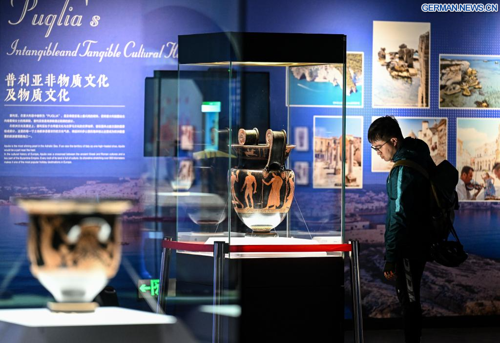 YINCHUAN, 31. März 2026 (Xinhuanet) -- Ein Besucher betrachtet Exponate auf der Ausstellung „Mythos auf Keramik“ im Ningxia-Museum in Yinchuan im nordwestchinesischen Autonomen Gebiet Ningxia der Hui, 27. März 2026. (Quelle: Xinhua/Feng Kaihua)