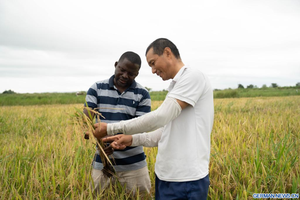 MAPUTO, 1. April 2026 (Xinhuanet) -- Li Yuhao (r.), ein Experte für Reis und landwirtschaftliche Verarbeitung aus der vierten Gruppe der chinesischen Landwirtschaftsexperten, die Mosambik unterstützen, erläutert einem lokalen landwirtschaftlichen Techniker auf der Landwirtschaftsstation Umbeluzi in der Provinz Maputo in Mosambik die Techniken zum Reisanbau, 19. März 2026. (Quelle: Xinhua/Liu Jie)