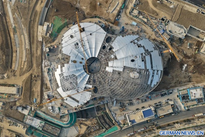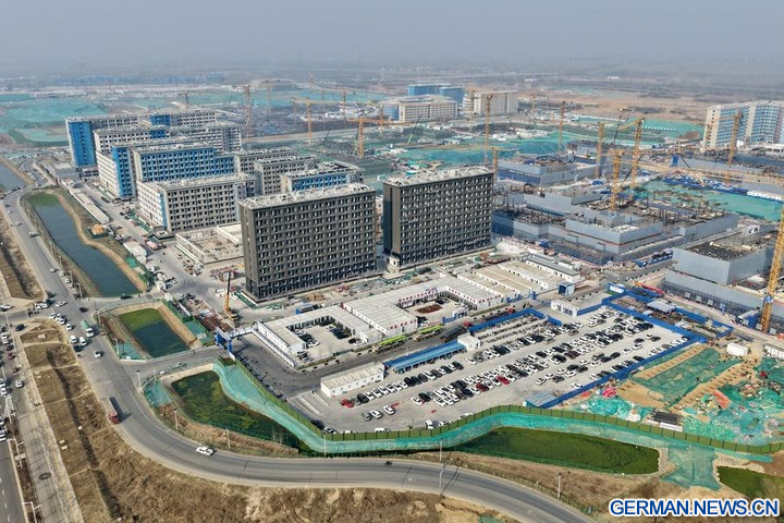 Die Luftaufnahme einer Drohne zeigt die Baustelle eines städtischen Kulturplatzes in der Xiong'an New Area in der nordchinesischen Provinz Hebei, 25. März 2026. (Xinhua/Mu Yu)