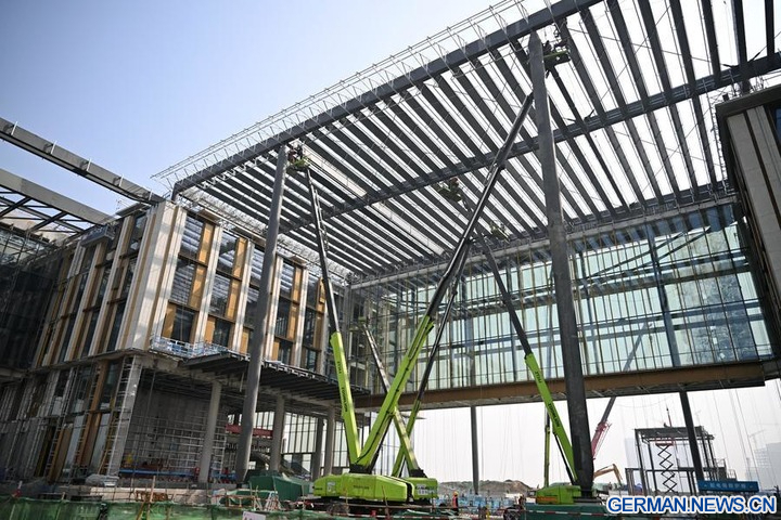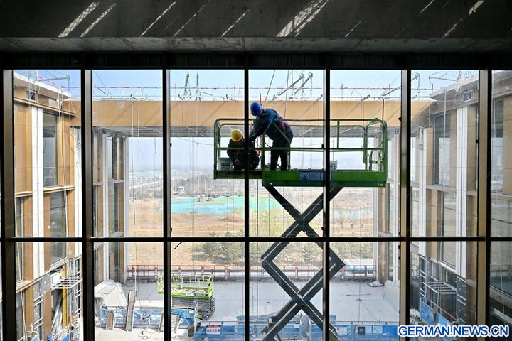 Mitarbeiter der China Construction Third Engineering Bureau Group Co., Ltd. arbeiten auf der Baustelle des Hauptsitzes der China Mineral Resources Group Ltd. in der Xiong'an New Area in der nordchinesischen Provinz Hebei, 25. März 2026 (Xinhua/Mu Yu)
