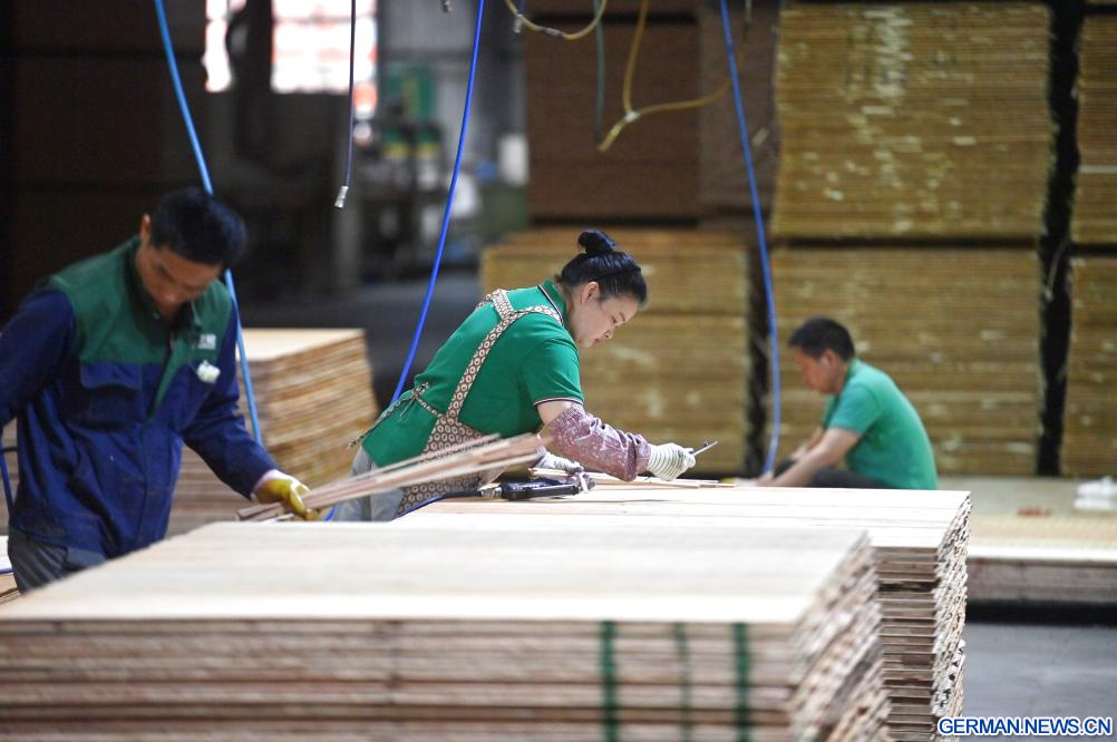 LIUZHOU, 2. April 2026 (Xinhuanet) -- Das Foto zeigt die Arbeiter an einem Fließband in einer Holzplattenfabrik im Kreis Rong'an in Liuzhou im südchinesischen Autonomen Gebiet Guangxi der Zhuang, 1. April 2026. In den vergangenen Jahren hat der Kreis Rong'an seine hochqualitativen Ressourcen an chinesischen Tannen voll genutzt, um die Wiederbelebung des ländlichen Raums voranzutreiben. Durch die Integration von Sämlingszucht, Anpflanzung, Holzverarbeitung und ländlichem Tourismus hat sich die mit chinesischen Tannen verbundene Industrie zu einem tragenden Wirtschaftszweig im Kreis Rong'an entwickelt und mehr als 20.000 Arbeitsplätze für lokale Bewohner geschaffen. (Quelle: Xinhua/Huang Xiaobang)
