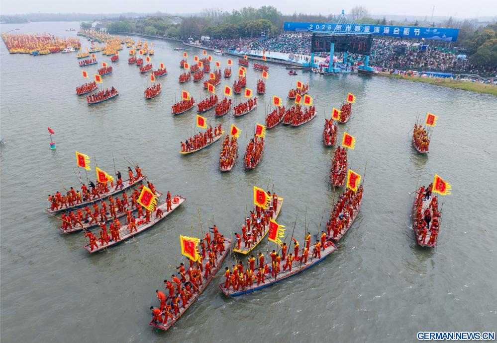 TAIZHOU, 6. April 2026 (Xinhuanet) -- Die Drohnenaufnahme vom 6. April 2026 zeigt Boote beim Wettbewerb des Qintong-Bootsfestivals im Nationalen Feuchtgebietspark Qinhu in der Gemeinde Qintong in der Stadt Taizhou in der ostchinesischen Provinz Jiangsu. Das Qintong-Bootsfestival hat seinen antiken Ursprung in der chinesischen Südlichen Song-Dynastie (1127–1279) und wird zur Erinnerung an Vorfahren sowie historische Helden abgehalten. Hunderte von Booten mit mehr als 10.000 Ruderern an Bord versammelten sich hier am Montag zum diesjährigen Festival, bei dem jedes Boot an einem Wettrennen teilnahm. Dieses jahrhundertealte große Wasserfest wurde als eines der nationalen immateriellen Kulturerbe des Landes anerkannt. (Foto von Tang Dehong/Xinhua)