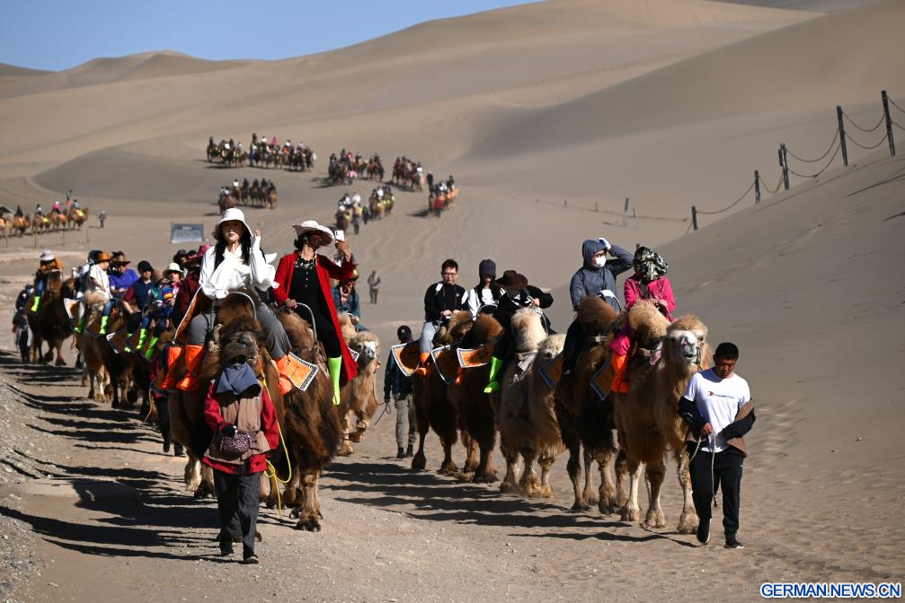 BEIJING, 7. April 2026 (Xinhuanet) -- Touristen reiten auf Kamelen im Landschaftsgebiet Mingsha-Berg und Mondsichelquelle in der Stadt Dunhuang in der nordwestchinesischen Provinz Gansu, 5. April 2026. (Foto von Zhang Xiaoliang/Xinhua)