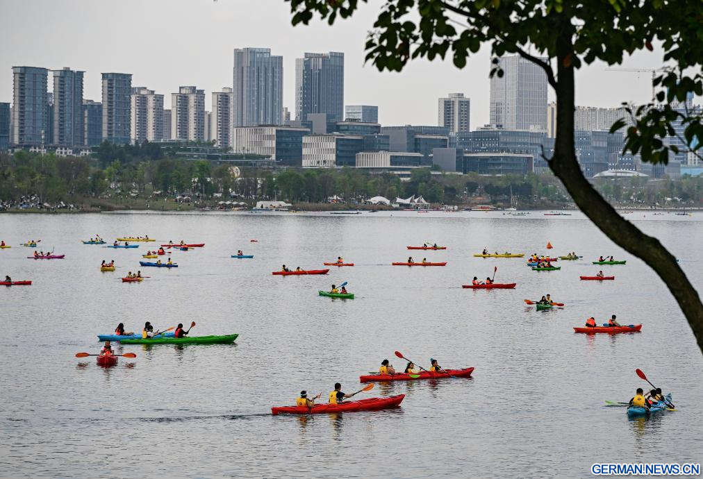 BEIJING, 7. April 2026 (Xinhuanet) -- Touristen erleben eine Kajaktour auf einem See in der Tianfu New Area der Stadt Chengdu in der südwestchinesischen Provinz Sichuan, 4. April 2026. (Foto von Li Xiangyu/Xinhua)