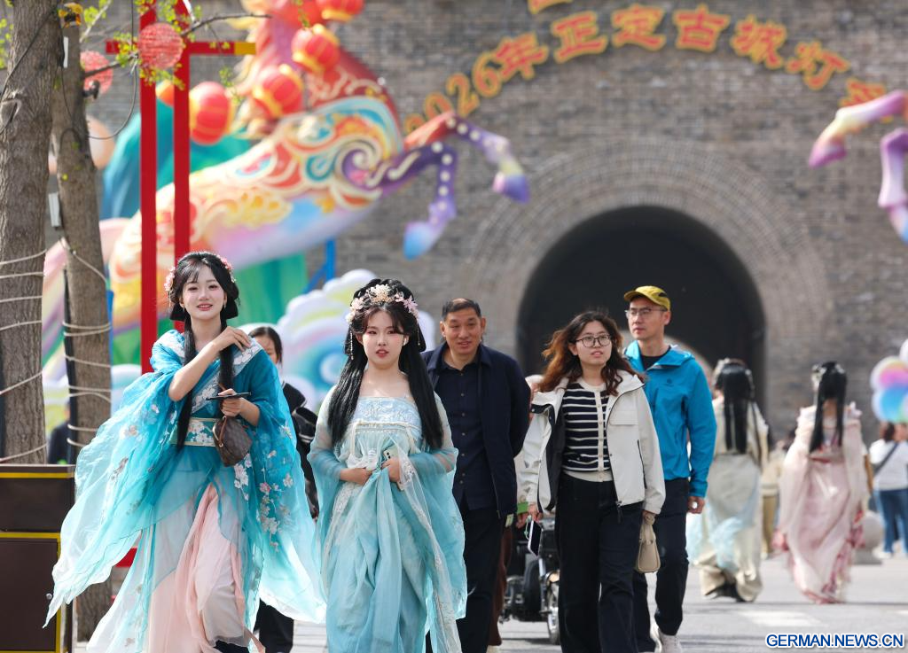 BEIJING, 7. April 2026 (Xinhuanet) -- Touristen besuchen die Altstadt Zhengding in Shijiazhuang in der nordchinesischen Provinz Hebei, 5. April 2026. Nach Angaben des Ministeriums für Kultur und Tourismus am Dienstag wurden in China 135 Millionen Inlandsreisen während der dreitägigen Qingming-Feiertage verzeichnet, was einem Zuwachs von 6,8 Prozent gegenüber dem Vorjahr entspricht, wobei die Tourismusausgaben um 6,6 Prozent auf fast 61,37 Milliarden Yuan (8,9 Milliarden US-Dollar) stiegen. (Foto von Liang Zidong/Xinhua)
