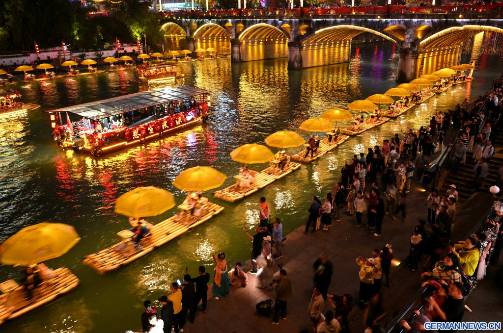 BEIJING, 7. April 2026 (Xinhuanet) -- Touristen fahren auf Bambusflößen auf einem Fluss im Kreis Xuan'en in der zentralchinesischen Provinz Hubei, 4. April 2026. (Foto von Song Wen/Xinhua)