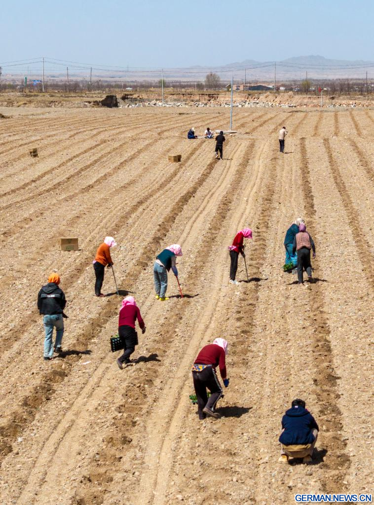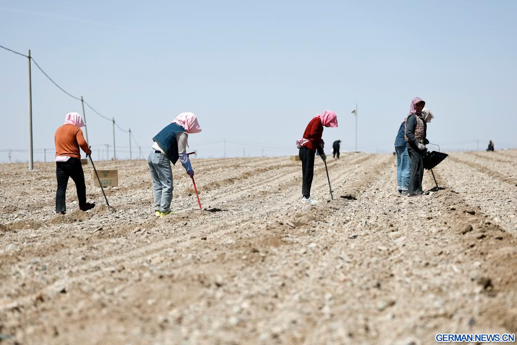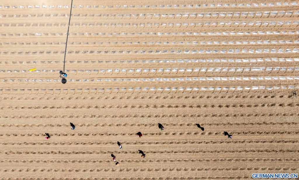ZHONGWEI, 7. April 2026 (Xinhuanet) -- Bauern pflanzen Xisha-Wassermelonen in der Gemeinde Xingren im Bezirk Shapotou in der Stadt Zhongwei im nordwestchinesischen Autonomen Gebiet Ningxia der Hui, 6. April 2026.