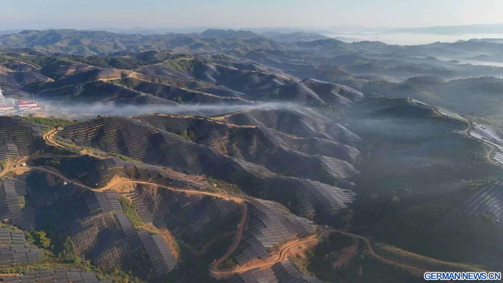 OUDOMXAY, 8. April 2026 (Xinhuanet) -- Die Luftaufnahme einer Drohne vom 29. Dezember 2026 zeigt ein von der China General Nuclear Power Group (CGNPC) entwickeltes 1.000-MW-Photovoltaikprojekt in der Provinz Oudomxay in Laos. (CGNPC/Handout via Xinhua)