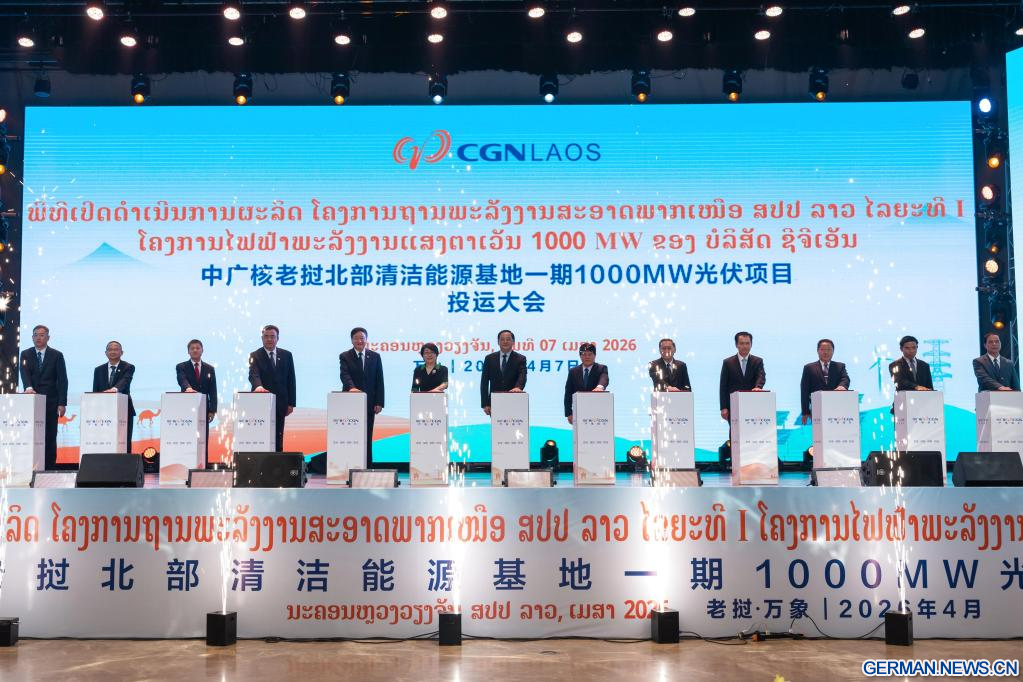 VIENTIANE, 8. April 2026 (Xinhuanet) -- Eine Zeremonie zur Feier der Inbetriebnahme eines von der China General Nuclear Power Group (CGNPC) entwickelten 1.000-MW-Photovoltaikprojektes wird in Vientiane in Laos abgehalten, 7. April 2026. (Foto von Kaikeo Saiyasane/Xinhua)
