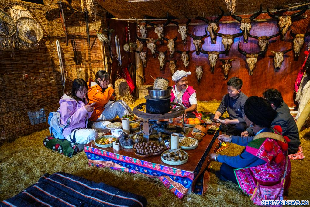 NYINGCHI, 8. April 2026 (Xinhuanet) -- Touristen vergnügen sich in einem Zelt zum Thema lokale Volkskultur auf einem Markt in der Stadt Nyingchi im südwestchinesischen Autonomen Gebiet Xizang, 3. April 2026. (Quelle: Xinhua/Tenzin Nyida)