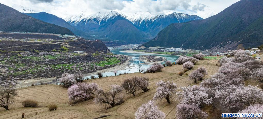 NYINGCHI, 8. April 2026 (Xinhuanet) -- Die Luftaufnahme einer Drohne vom 3. April 2026 zeigt die Pfirsichblüten am Fuße des Mount Namcha Barwa in der Stadt Nyingchi im südwestchinesischen Autonomen Gebiet Xizang.