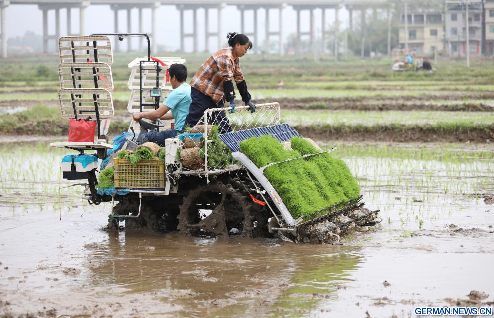 BEIJING, 9. April 2026 (Xinhuanet) -- Das Foto vom 8. April 2026 zeigt Bauern, die eine Landmaschine bei der Anpflanzung von Frühjahrsreis auf einem Feld in Yongzhou in der zentralchinesischen Provinz Hunan bedienen. (Foto von He Hongfu/Xinhua)