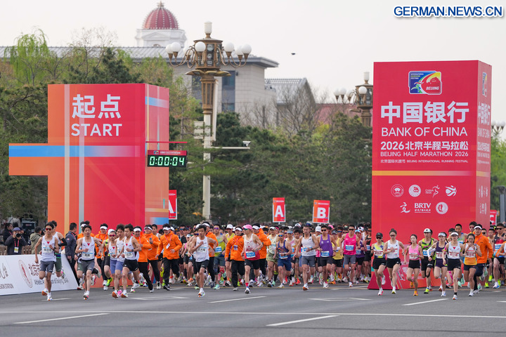 BEIJING, 12. April 2026 (Xinhua) -- Teilnehmer starten beim Beijing-Halbmarathon 2026 in der chinesischen Hauptstadt Beijing, 12. April 2026. (Xinhua/Ju Huanzong)