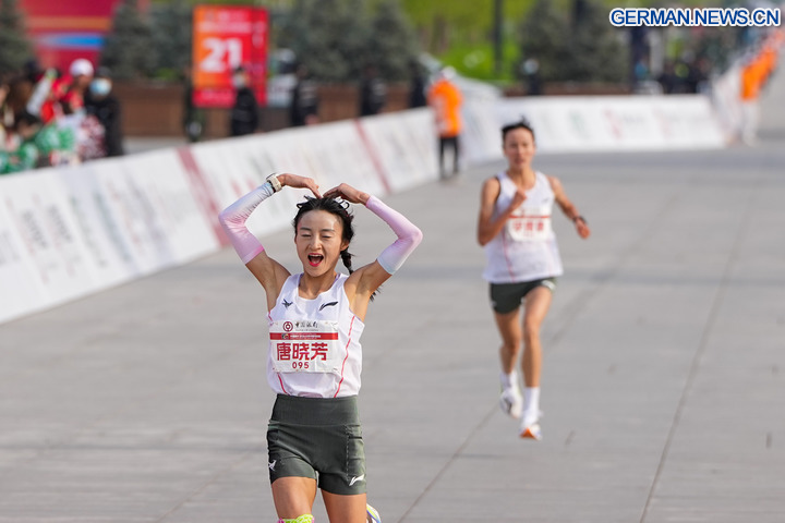 BEIJING, 12. April 2026 (Xinhua) -- Teilnehmerinnen überqueren die Ziellinie beim Beijing-Halbmarathon 2026 in der chinesischen Hauptstadt Beijing, 12. April 2026. (Xinhua/Ju Huanzong)