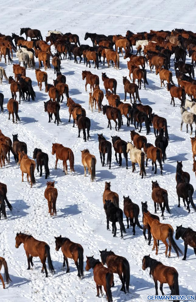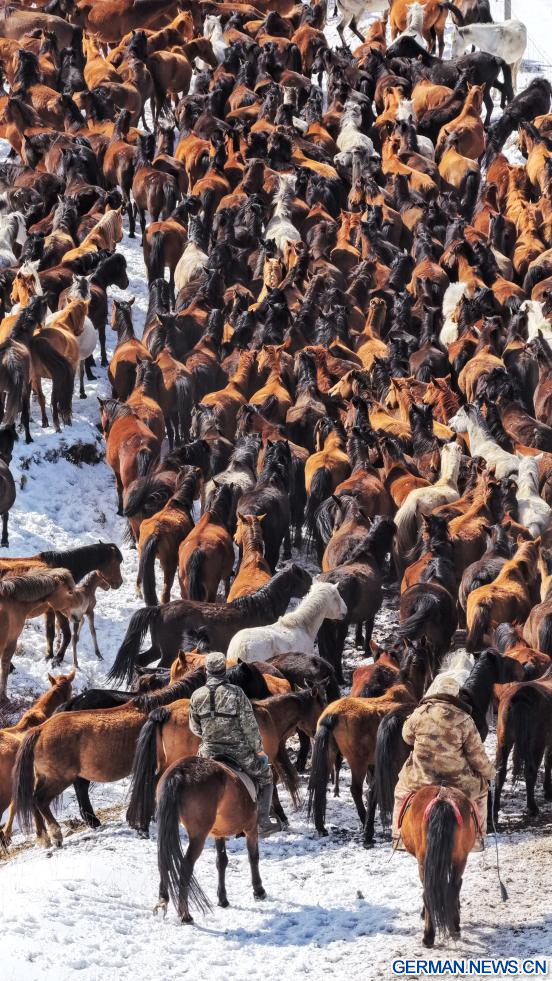 ZHANGYE, 14. April 2026 (Xinhuanet) -- Die Luftaufnahme einer Drohne vom 14. April 2026 zeigt die Pferde der Shandan Horse Breeding Farm in der nordwestchinesischen Provinz Gansu. Während der Saatzeit begannen die Hirten, die Pferdeherden von den Ackerflächen auf natürliche Weideflächen zu treiben. (Foto von Wang Chao/Xinhua)