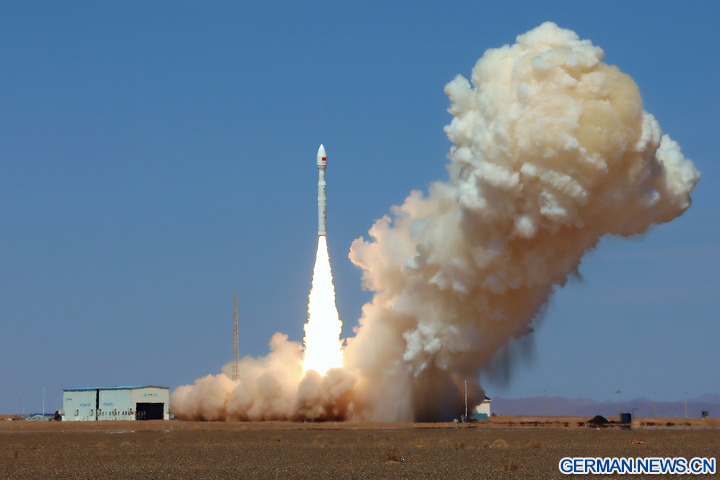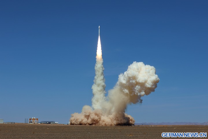 JIUQUAN, 14. April 2026 (Xinhua) -- Eine Trägerrakete vom Typ „Lijian-1 Y12“ startet mit acht Satelliten von der Dongfeng-Pilotzone für kommerzielle Weltrauminnovation im Nordwesten Chinas, 14. April 2026. Die Rakete startete um 12:03 Uhr (Ortszeit Beijing) und brachte die Satelliten erfolgreich in ihre geplanten Umlaufbahnen. (Foto von Wang Haixia/Xinhua)